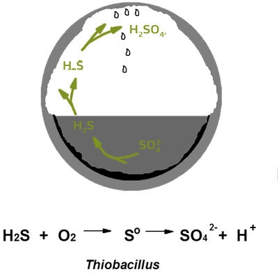 Eine Eigenschaft von Schwefelwasserstoff ist, dass er Abwasserrohre und Bauteile von Abwasserbehandlungsanlagen korrodiert. Er greift Beton, Kupfer, Eisen und Silber an. Unter den heißen und feuchten Umgebungsbedingungen in einem Abwasserrohr wird Schwefelwasserstoff durch Thiobacillus-Bakterien (gram-negativ) an den Wänden des Rohrs zu Schwefelsäure oxidiert. Diese Schwefelsäure ist korrosiv und greift die Infrastruktur der Abwasserbehandlunganlage an. Von Korrosion sind insbesondere die unter Wasser befindlichen Strukturen in Abwassersystemen oder in Abwasserbehandlungsanlagen betroffen.