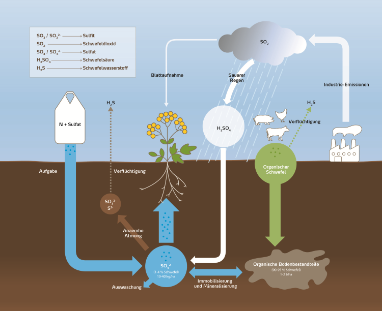 Schwefel im Boden kann unabhängig davon, ob er als elementarer Schwefel, organischer Dünger oder Sulfat zugeführt wurde, nur in Form von Sulfat von den Pflanzen aufgenommen werden. Wird Sulfat direkt eingebracht, ist eine gute Verwertung gewährleistet.