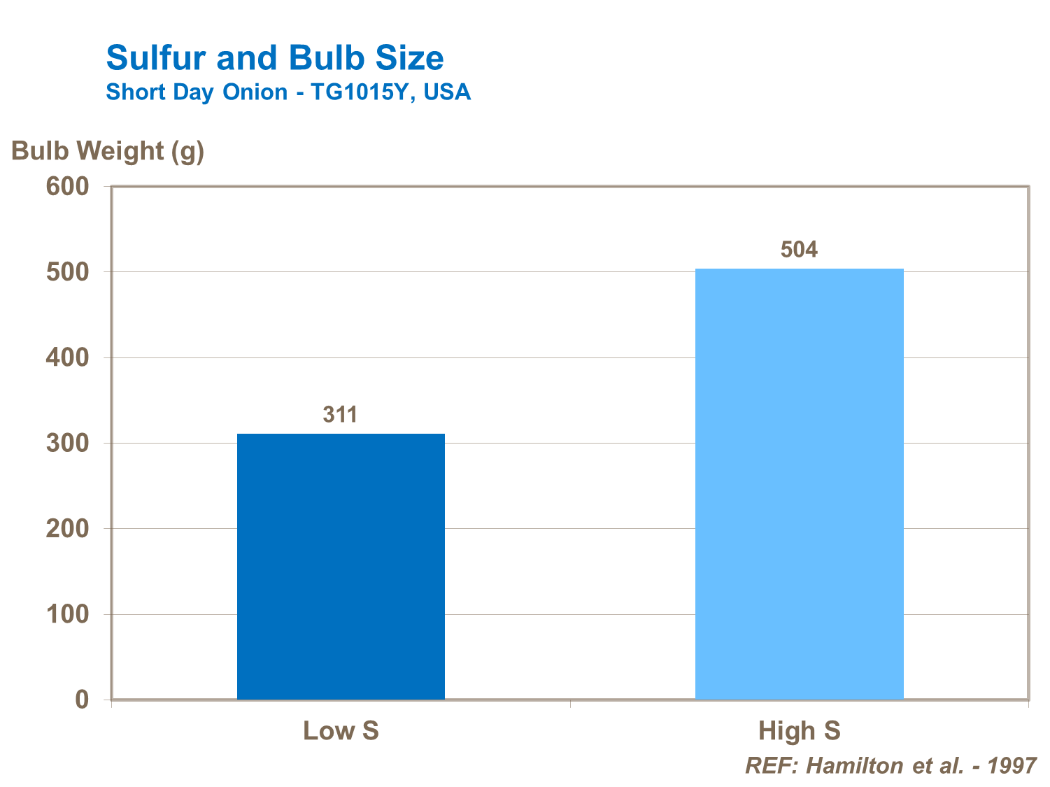 Most sulfur uptake occurs in late season during bulb growth. Sulfur helps to improve the crop's utilization of nitrogen. Plants with a high sulfur content have greater tolerance to pest and disease attack. Sulfur has also been linked to increasing skin strength and color.