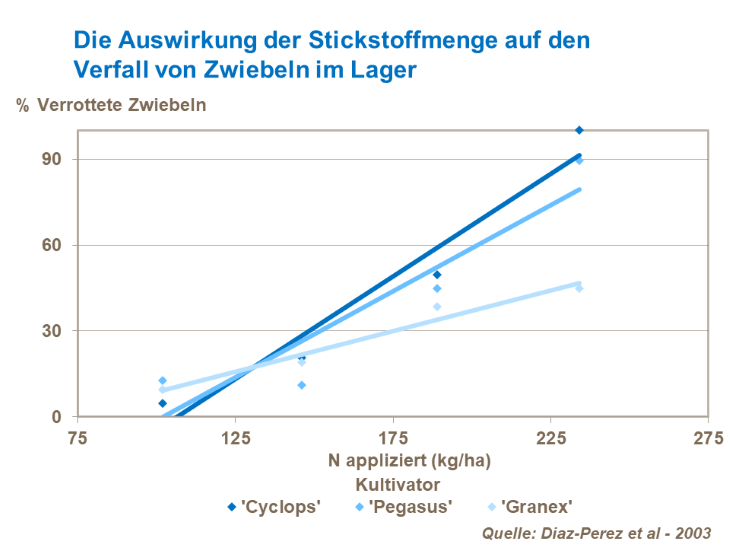 Ein Stickstoff-Überschuss kann zu Zwiebel- und Lagerfäule führen, was wiederum Lagerverluste zur Folge hat. So ein Überschuss kann auch das Pflanzengewebe schwächen und die Anfälligkeit für Kälteschäden erhöhen (Studien in den USA).